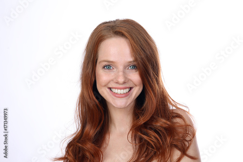 woman, young, portrait, beauty, isolated, white, hair, smile, face, happy, pretty, person, smiling, people, model, 1, eye, teenage, looking, redheaded, merry, happiness, fashion, casual, red hair, cosmetic, natural
