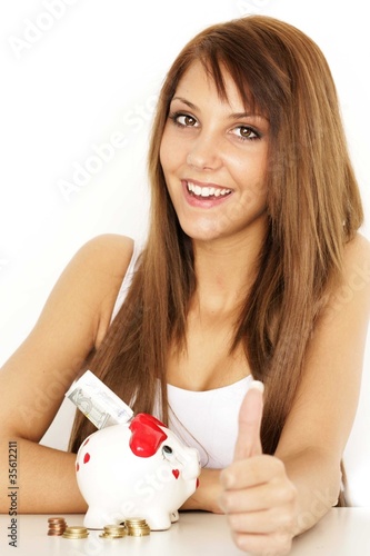 attractive, commercial, woman, alone, sexy, white, number one, girl, female, modern, brown, generous, brash, fun, happy, happy, laugh, funny, man, studio, pretty, hot, fashionable, saving, piggybank, pig, money, red, cardiac, heart, young, self-assured, thrifty, successful, confident, financial