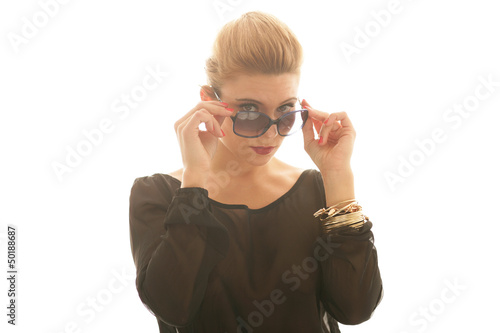 woman, girl, female, young, adult, pretty, pretty, attractive, hair, brown, blond, chain, necklace, earring, blouse, black, expression, express, face, look, charisma, confident, self-assured, lifestyle, lifestyle, hand, lip, red, attitude, pose, ornament, braid, make-up, eye, spectacle, silence, shh, bright, sexy, sunglasses, photographer, shooting, model, fashion, closeup, secret, secret, stern