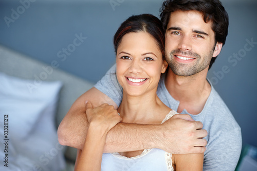 Hug, portrait and trust with couple in bedroom of home together for bonding, marriage or support. Face, love or smile with happy man and woman in apartment to relax for morning or weekend time off