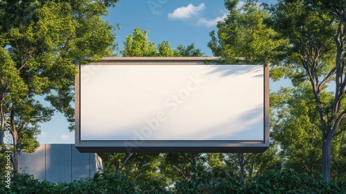 Huge empty poster template displayed on a modern mall roof, framed by surrounding trees and open sky.