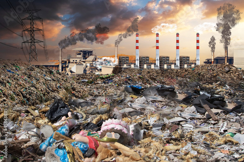Huge garbage pile landfill and emissions factory with power plant plastic pollution crisis. global warming, Ecosystem and healthy environment concepts