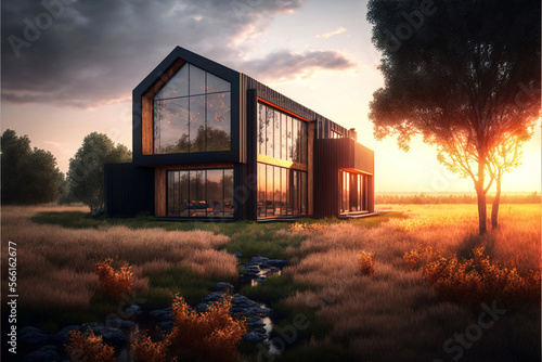 Huge modern design house with black facade in the nature. Warm colors. Designed using generative ai.