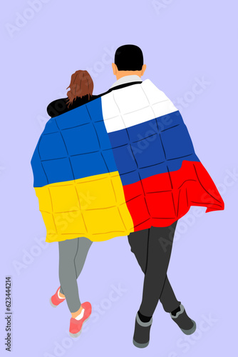 Hugged Ukraine woman Russian man stick together vector illustration isolated. Emotional people boy hug girl covered with national flag mixed. Couple in love. Happy lovers hugging, boyfriend girlfriend