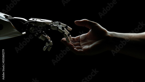 Human and robot hands reaching out, AI, Machine learning, Robot and human touching on big data, Science and artificial intelligence digital technologies of futuristic