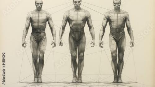 Human body pencil drawing showing symmetrical grid and height marks