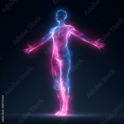 human body soul aura neon glow blue and pink black bckground silhouette chakravital energy concept mind sotericism psychology