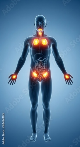 Human body with highlighted internal organs glowing through transparent figure illustrating anatomy health systems circulation digestion and medical visualization technology