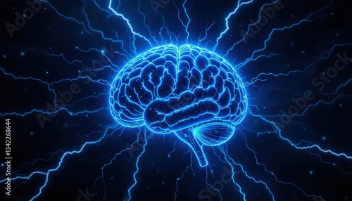Human brain digital illustration. Electrical activity, flashes and lightning on a blue background. Digital Illustration of the Human Brain. Electrical Activity, Flashes, and Lightning on a Blue Backgr