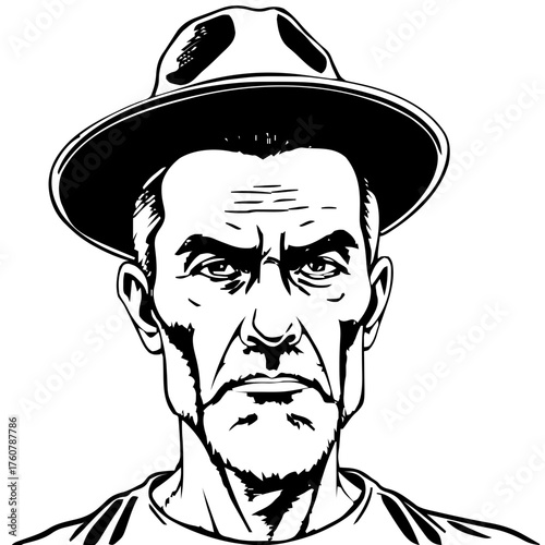 aged, and, androgynous, black-and-white, rimmed, bust, centered, composition, determined, fine, hat, hatching, knot, line art