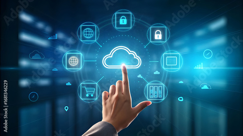 technology, datum, cyberspace, connection, futuristic, innovation, information, storage, security, icon, touch screen, hand, finger, abstract, blue, glowing, digital, network, tech, business, software, server