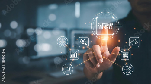 Human finger touches glowing customer insights icon on dark digital interface for business