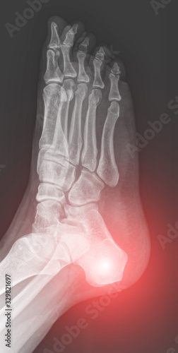 Human foot ankle and leg in x-ray, on gray background. The foot ankle is highlighted by red colour.