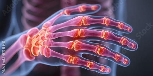 hand, bone, skeleton, joint, anatomy, medicals, human, body, health, orthopedics, arthritis, rheumatism, pain, diagnosis, therapy, radiology, x-ray, scan, imaging, science, biology, structure, finger, wrist, carpal, cartilage, disease, injury, fracture, healing, treatment, research, education, clinic, hospital, health care, digital, illustration, three-dimensional, render, transparent, glowing, red, blue, purple