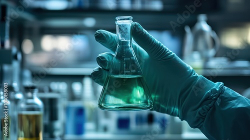 Human hand in glove holding flask bottle in modern labaratory, close-up photo