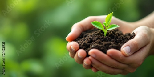 Human hands holding soil with young green plant seedling against blurred nature background. Environmental care, gardening, new life growth and earth day concept