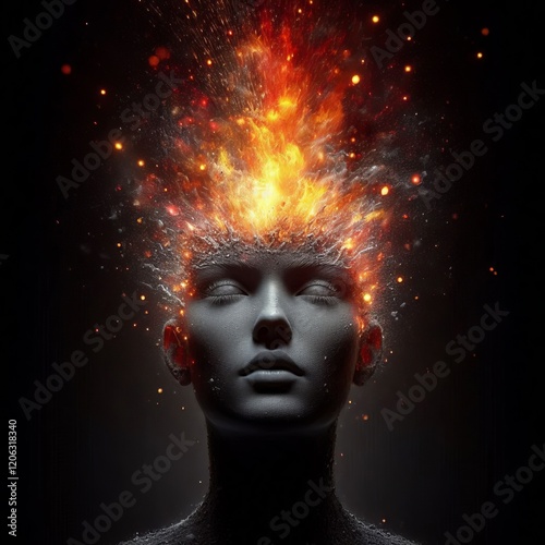 human head with a fiery explosion bursting upward, representing intense thoughts and passion