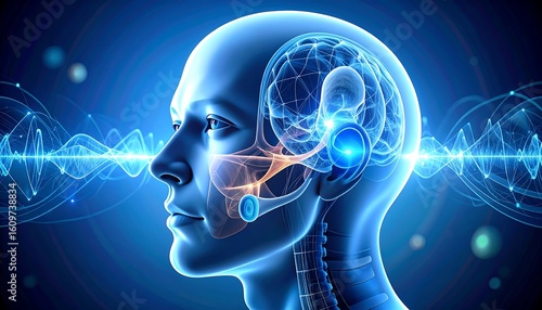 human head, brain, brain wave, hearing, anatomy, medicals, health care, science, technology, neural, connection, digital illustration, artificial intelligence, human, head, scanning, listening, body, system, internal, transparent, glowing, light, profile, half face, ai, communication, sound, signal, medicine, research, datum, innovation, analysis