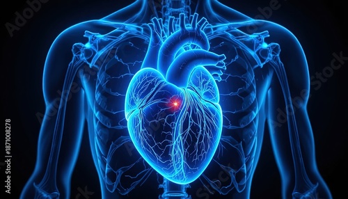 Human Heart Anatomy Illustration with Chest and Shoulders in Blue on Black Background