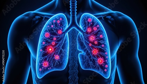 Human lungs with virus infection shown in glowing blue and red