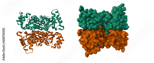 Human nucleoside diphosphate kinase 4. 3d cartoon and Gaussian surface models, chain id color scheme, PDB 1ehw
