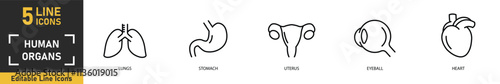 Human Organs line icon set. Set of 5 outline icons related to lungs, stomach, uterus, eyeball, heart and more. Vector illustration.