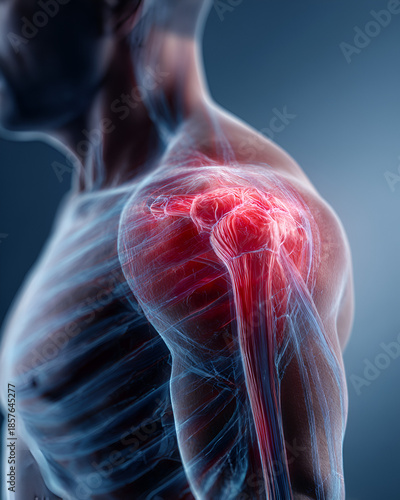 shoulder, muscle, human, anatomy, red, blue, joint, structure, connection, three-dimensional, rendering, detailed, arrangement