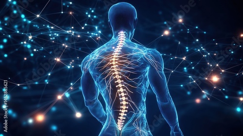 human, body, spine, anatomy, digital, rendering, three-dimensional, medicals, health care, science, technology, network, connection, datum, visualisation, neural, biology, light, abstract, background, futuristic, illustration