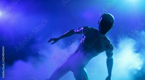 robot, android, dancing, dance, artificial, intelligence, ai, technology, futuristic, future, innovation, robotic, android, cyborg, automation, movement, performance, smoky, atmosphere, lighting, blue, purple, neon, dark, science, fiction, fi, machine, electronic, digital, three-dimensional, rendering, computer, graphic, virtual, reality, character, pose, action, dynamic, energy, entertainment, show, stage, spotlight, smoke