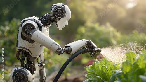 Humanoid robot holding hose watering vegetable plants in garden.