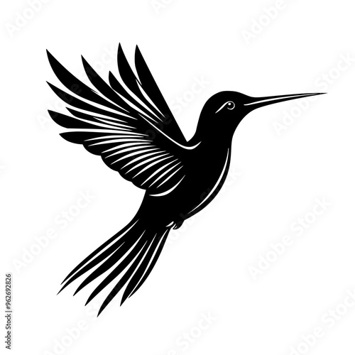 Hummingbird silhouette in mid-flight, Graceful black-and-white silhouette of a hummingbird in mid-flight, perfect for nature logos, wildlife designs, and branding.