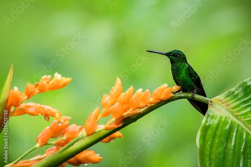 Hummingbird sitting on orange flower,tropical forest,Ecuador,bird sucking nectar from blossom in garden,bird perching on plant,nature wildlife scene,clear background,exotic adventure,environment