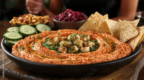 hummus, platter, snack, food, cookery, dish, vegetable, cucumber, chips, tortilla, beetroot, chickpea, parsley, oil, olive, mediterranean, delicious, tasty, healthy, vegan, vegetarian, fresh, presentation, rustic, wooden, plate, bowl, dark, background, eat, dining, meal, epicure, closeup, studio, shot, tabletop, arrangement, colourful, nourishment, ingredient, widener, dip, culinary, style, texture