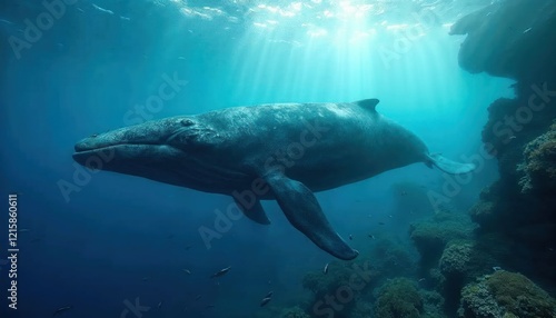 Humpback Whale in the Deep Blue: A magnificent humpback whale glides effortlessly through the deep blue ocean, bathed in a radiant glow of sunlight.