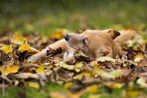 Hund liegt im Herbstlaub