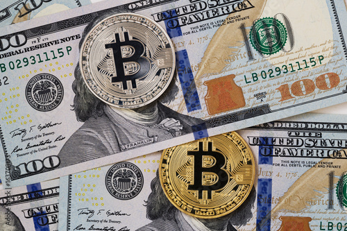 Hundred dollar bills with bitcoin covered face. Anonymous payment concept.