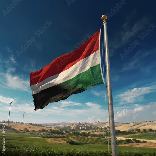 Hungarian flag waving proudly against a vibrant blue sky with clouds
