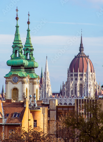 Hungary Budapest, city landscape view of the Parliament among the trees