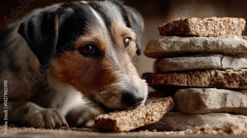 Hungry dog in dry foods mound during big feast concept. A playful dog curiously interacting with stacked stones.