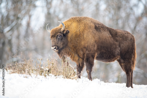 grazing, grass, snow, winter, bison, dry, pasture, horizontal, eating, standing, freezing, natural, european, ecosystem, endangered, winterly, horn, wildlife, wilderness, wild, conservation, animal, nature, big, tree, brown, cold, bull, timberland, mammal, wood, fauna, forest, strength, habitat, fur, huge, weather, sturdy
