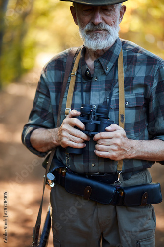 Hunter with grey beard in huntig period in forest. Stand looking down