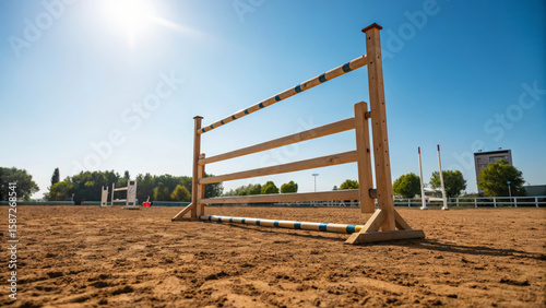 equestrian, hurdle, arena, activity, sand, clear, sky, sunny, competition, training, peaceful, wood, obstacle, sport, horse, riding, event, field, summer, recreation, fence, jump, athletic, rural, landscape, blue, day, exercise, equine, practice, challenge, leisure, open, ground, countryside, preparation, equestrianism, stable, calm