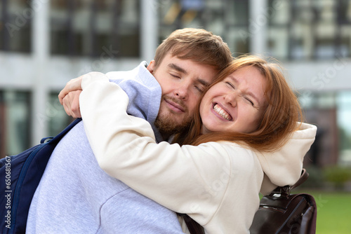 husband, wife, family, couple in love hugging, embracing. girl, guy spend time together outdoors. young woman, man beginning loving romantic relationship. happy male, female smiling