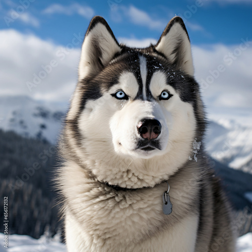 Husky, photography, blue-eyed, fluffy, majestic, on a snowy mountain trail, adventurous, bright midday light, cool whites and grays Generative AI