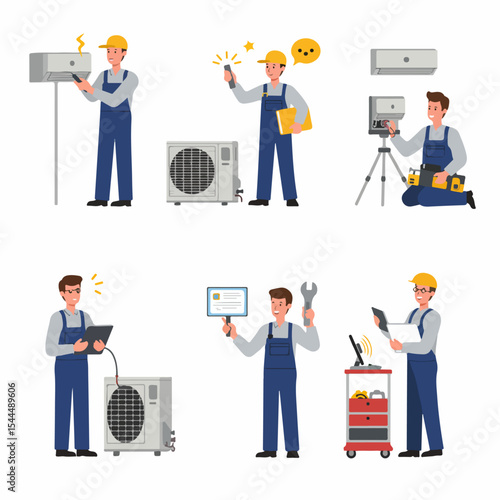 technician, air conditioner, repair, service, installation, maintenance, men at work, professional, man, uniform, tool, job, heating, cooling, contractor, skilled, labor, occupation, expert, trade, equipment, diagnostic, inspection, troubleshooting, certificate, technology, tablet, wrench, screwdriver, overall, hard hat, safety, comfort, efficiency, dependability, handyman, residential, commercial, illustration, vector, blue, yellow, grey