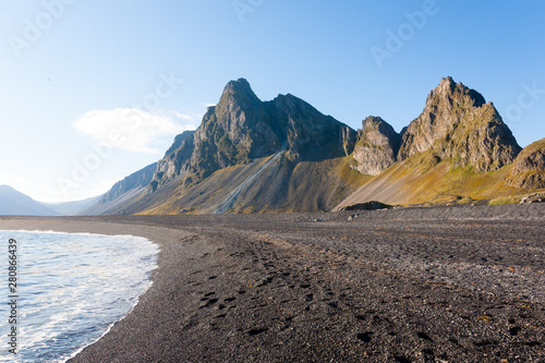iceland, attraction, background, beach, beautiful, beauty, blue skies, cliff, coast, coastline, day, daylight, east, geologic, horizon, icelandic, island, isolation, landform, landmark, landscape, lava, location, mountain, nature, nobody, ocean, outlook, panorama, rock, scenery, scenic, shoreline, summer, travel, view, volcanic, volcano