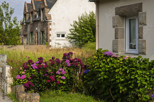 Hydrangea flower beds at the foot of an old villa in Perros Guirec, Brittany, France