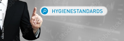 Hygienestandards. Mann im Anzug zeigt mit dem Finger auf ein Suchfeld. Der Begriff Hygienestandards steht in der Suche. Symbol für Business, Finanzen, Statistik, Analyse, Wirtschaft