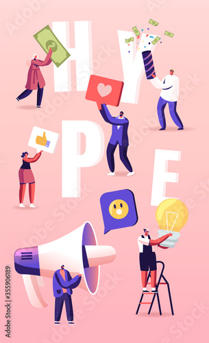 Hype, Social Media Viral or Fake Content Spreading Concept. Tiny Characters with Huge Letters and Megaphone. Money Bills Flying around. Poster Banner Flyer. Cartoon People Vector Illustration