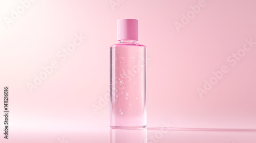Hyper-realistic clear cosmetic packaging mockup featuring a transparent bottle with pink serum, minimalist design, soft pastel background, and studio lighting. Perfect for beauty brands